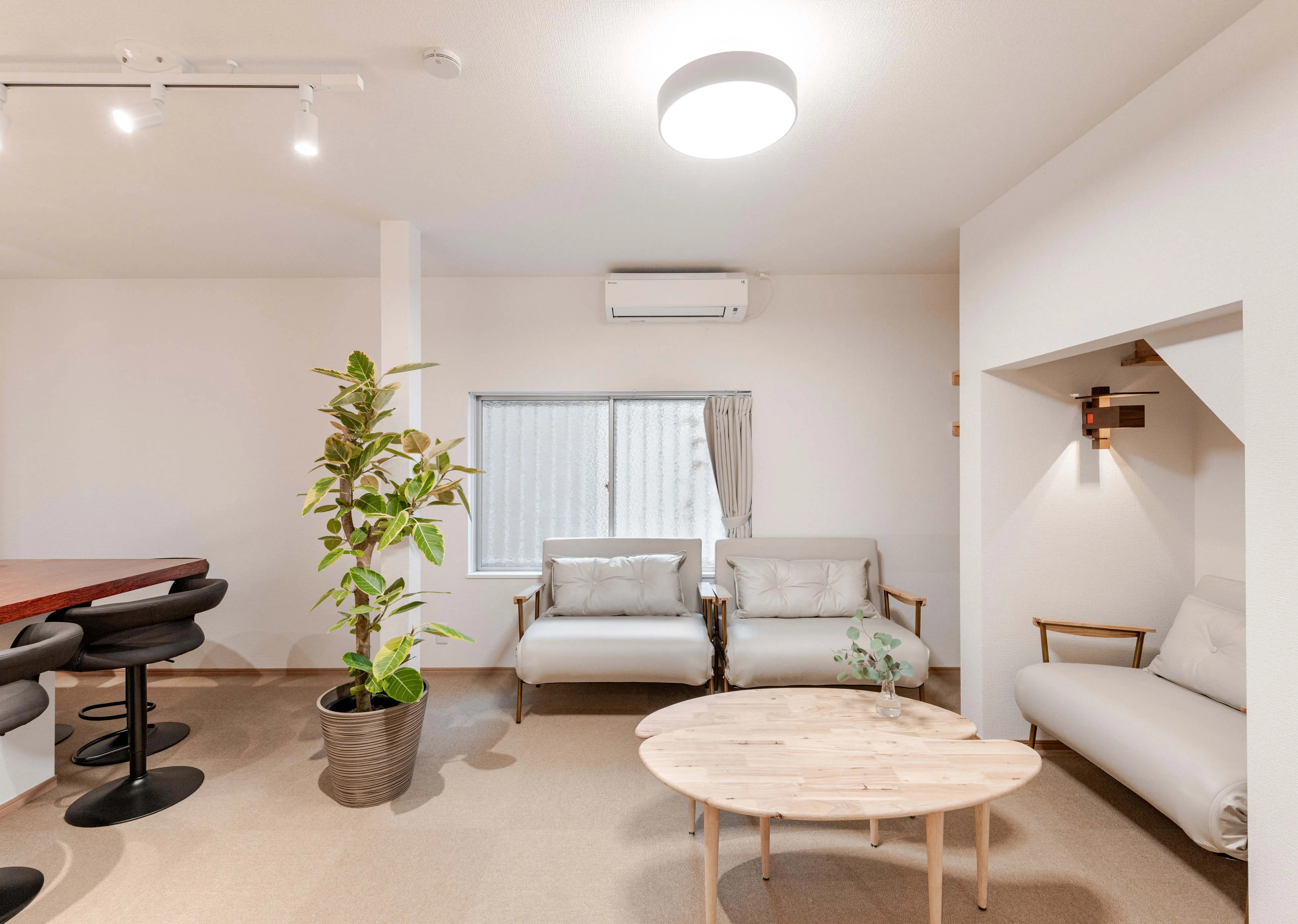 丁寧にリノベーションされた一軒家は、寝室や水回り、家電類まで新品で統一。無垢の一枚板バーカウンターが印象的なリビングと、業務用キッチン・製氷機を備えた空間で、仲間との語らいや食事の時間をゆったりとお過ごしいただけます。